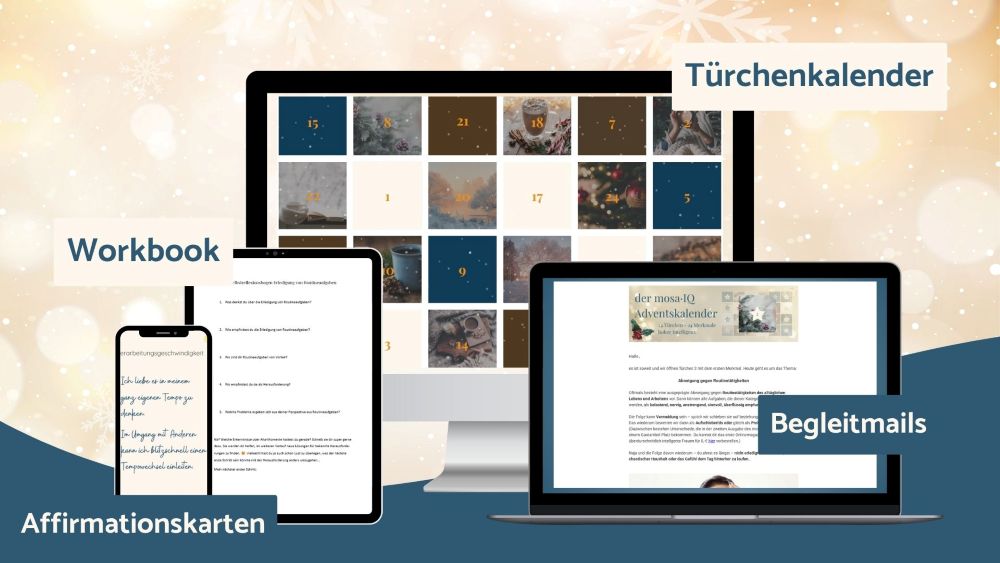 In 2024 hab ich erstmalig den Türchenkalender „24 Tage – 24 Türchen – 24 Merkmale hoher Intelligenz“ veröffentlicht. 92 Frauen haben damit eine neue Perspektive auf Persönlichkeitseigenschaften gewonnen. In diesem Jahr veröffentliche ich täglich einen kurzen Blogbeitrag mit der Beschreibung des Merkmals, im Workbook der 0€ Variante findest du die dazugehörigen mögliche Umsetzungsblockaden.